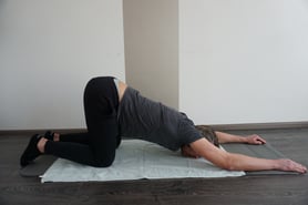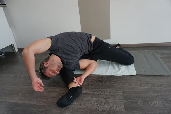 - Een wat meer uitdagende oefening. U brengt één been gebogen naar voren en de andere gebogen naar achteren zodat u een S vorm krijgt. Nu probeert u de schouder in de knieholte van uw been te krijgen. De andere arm kunt u over uw hoofd naar de grond toe brengen waardoor u ook rek krijgt op de ribbenkast.