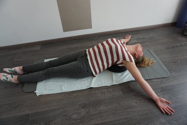 - Leg het kussen tussen de schouderbladen, de armen gespreid en de nek vrij. Na de 3 minuten de hoofd ondersteunen en er rustig vanaf rollen.